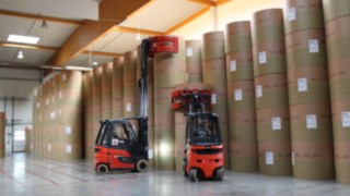 „Das Handling von 1,6 Tonnen schweren Papierrollen ist wesentlich anspruchsvoller, als palettierte Ware von A nach B zu befördern“, berichtet Geschäftsführer Marc Bode. Die Entscheidung für diese komplexe Aufgabe fiel auf Maschinen von Linde, unter anderem aufgrund überzeugender Erfahrungen bei früheren Mieteinsätzen. Linde-Stapler im Transport von Papierrollen bieten entscheidende Vorteile, wie Christian Sobenko, Verkäufer bei Jetschke ausführt: „Die obenliegenden Neigezylinder sorgen für eine erhöhte Stabilität beim Transport, auch in fünf Metern Höhe.“ Darüber hinaus bietet die Präzision und Kontrolle, die durch die obenliegenden Neigezylinder ermöglicht wird, eine optimale Handhabung der Papierrollen in engen Lagerräumen oder beim Entladen der Waggons. Aufwendiges Rangieren ist nicht mehr notwendig und die Effizienz der Abläufe wird verbessert.