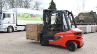 „Schon bei der Probefahrt hat uns der H35 unter anderem mit seiner guten Federung überzeugt, im Vergleich zum Vorgängergerät ein Unterscheid wie Tag und Nacht“, erzählt Juniorchef Hannes Burmeister. Der Stapler legt täglich mehrere Fahrten über den gepflasterten Hof zurück, angesichts dessen ist eine hochwertige Federung von enormer Bedeutung. Dennis Dombrowski, Verkäufer bei Jetschke ergänzt: „Der Linde H35 erfüllt mit seiner Tragfähigkeit von bis zu 3,5 Tonnen und einer maximalen Hubhöhe von 5,5 Metern exakt die Anforderungen, die Hof Burmeister stellt.“ Die feinfühlige Steuerung ermöglicht es den Bediener*innen, selbst in engen Hallen sicher und präzise zu manövrieren. Bei bis zu 12 Stunden täglicher Einsatzzeit in Spitzenzeiten ist eine ergonomische Gestaltung von hoher Wichtigkeit. Features wie Luftfederung, Lendenwirbelstütze, Sitzheizung oder Sitzbelüftung tragen dazu bei, dass der H35 auch bei langen Arbeitstagen höchsten Komfort bietet und die Produktivität der Mitarbeitenden zusätzlich steigert.